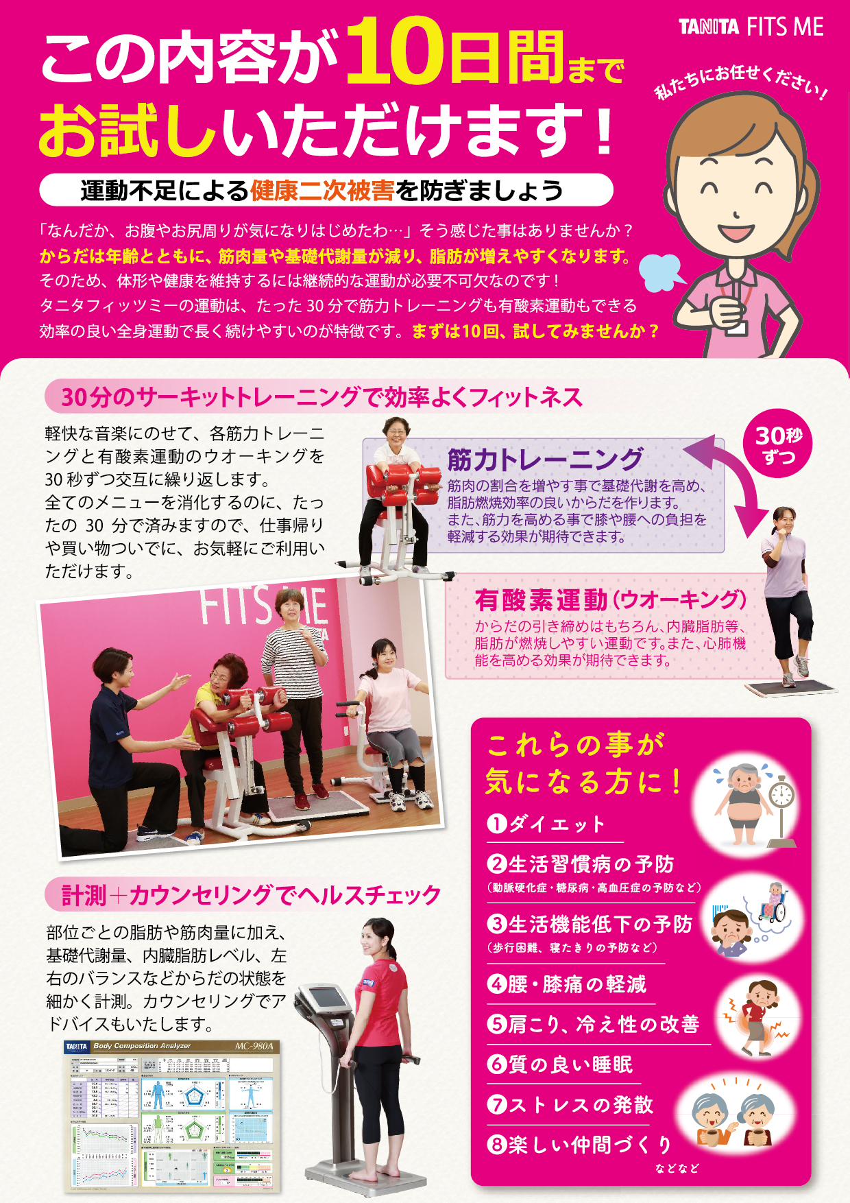 アキレス腱を切ってから時々痛むのとダイエットが目的でしたが、タニタフィッツミーに通い出して、体重の管理が出来るようになり、その上筋肉が付いてきたようで、フルタイム勤務なのでこの年齢でも仕事でバリバリ動けるので快適です。